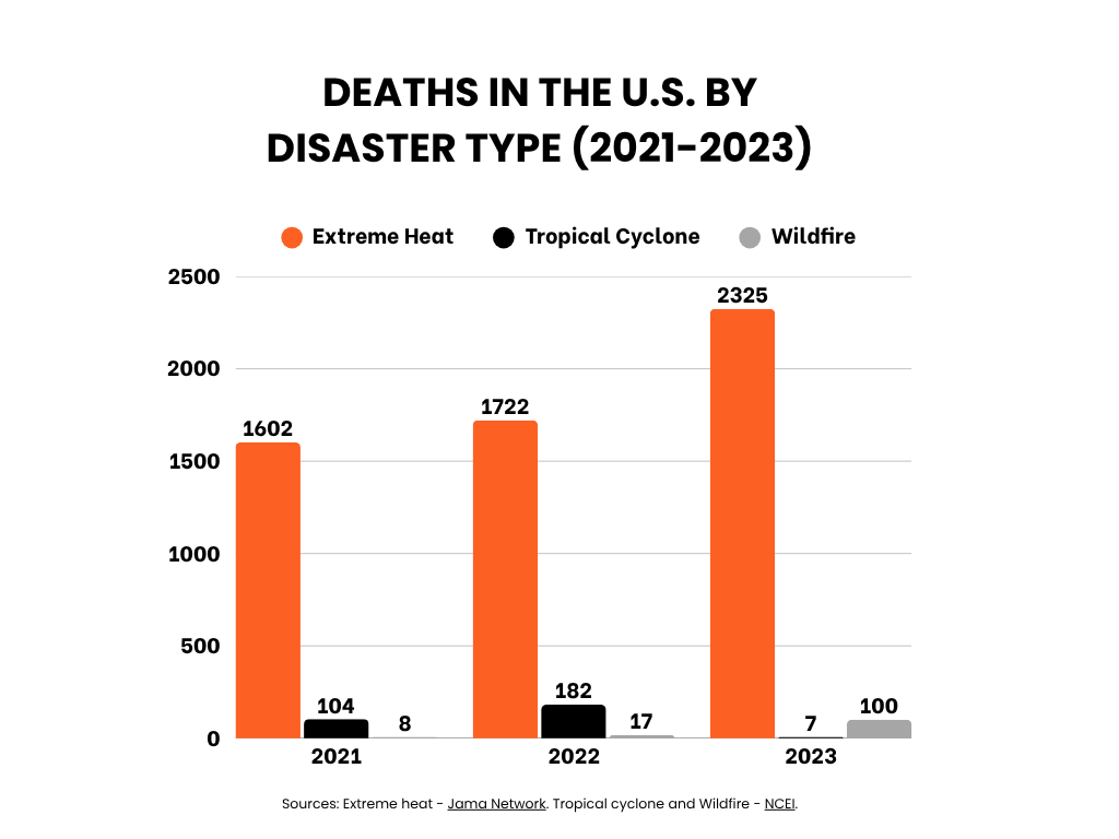 And the deadliest hazard in the United States is not wildfires or floods—it’s extreme heat, which killed over 2,000 people in the U.S. in 2023 alone.