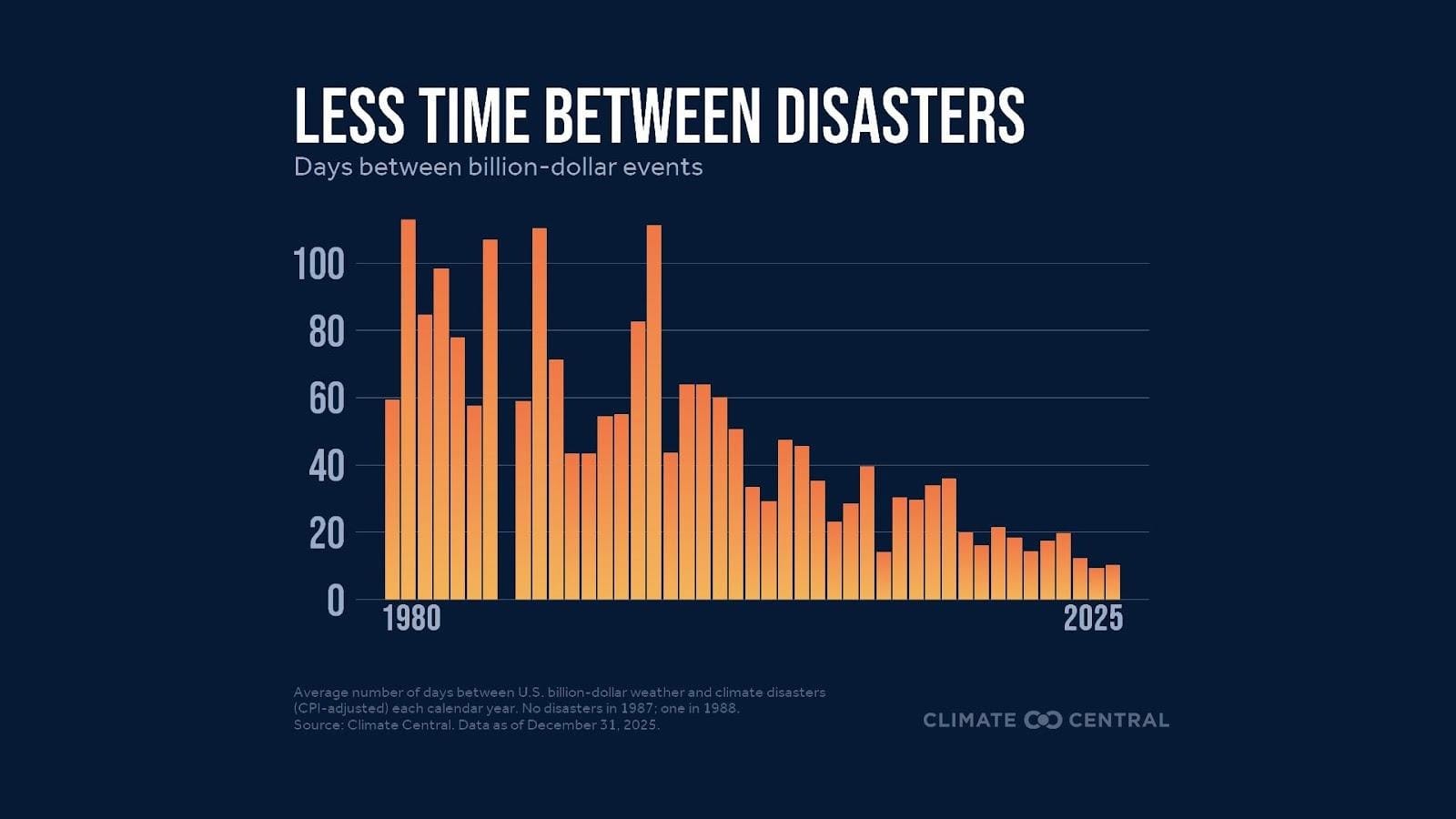 On average, the U.S. had just 10 days between billion-dollar disasters in 2025, compared to over 80 days in the 1980s.